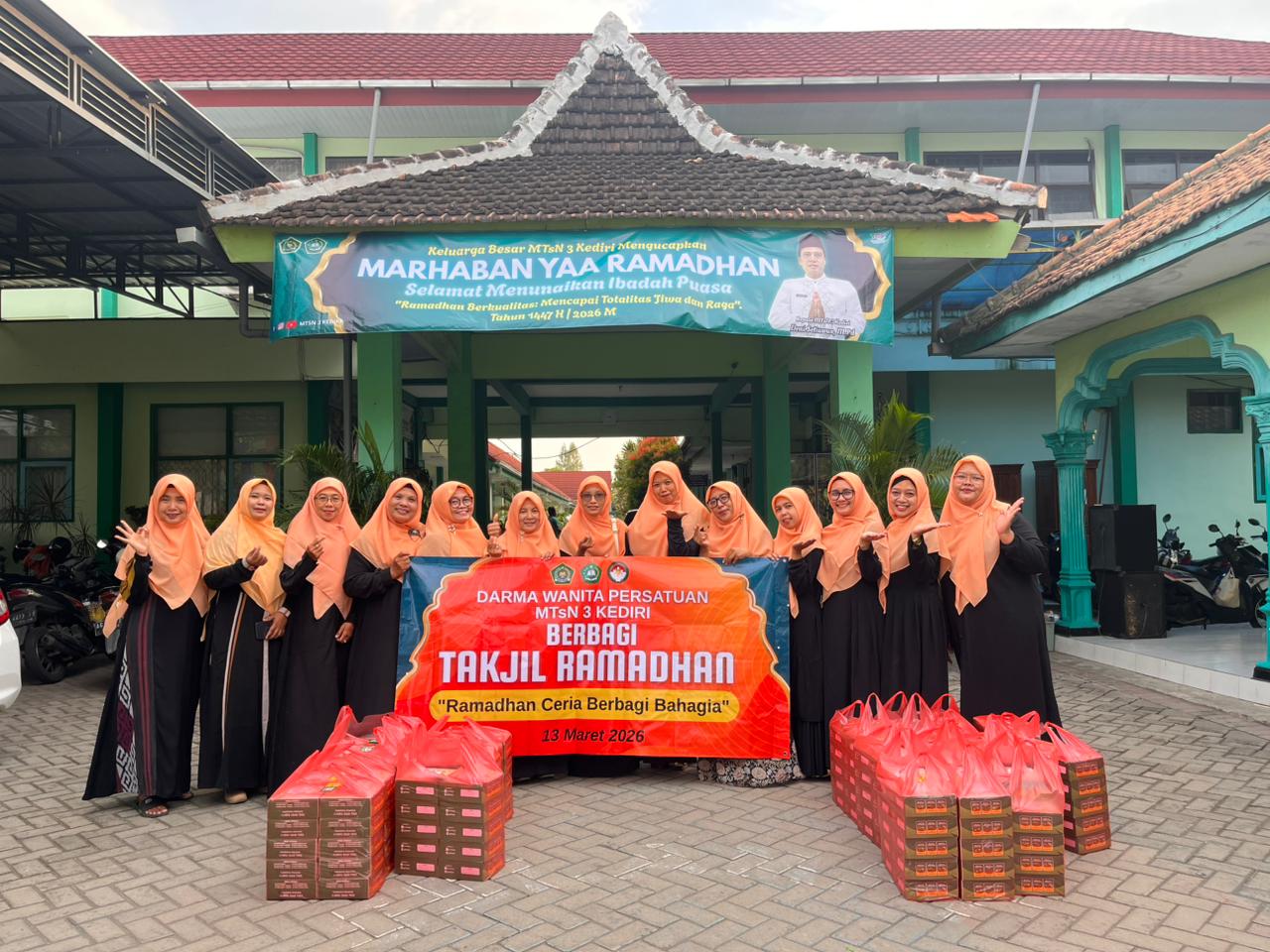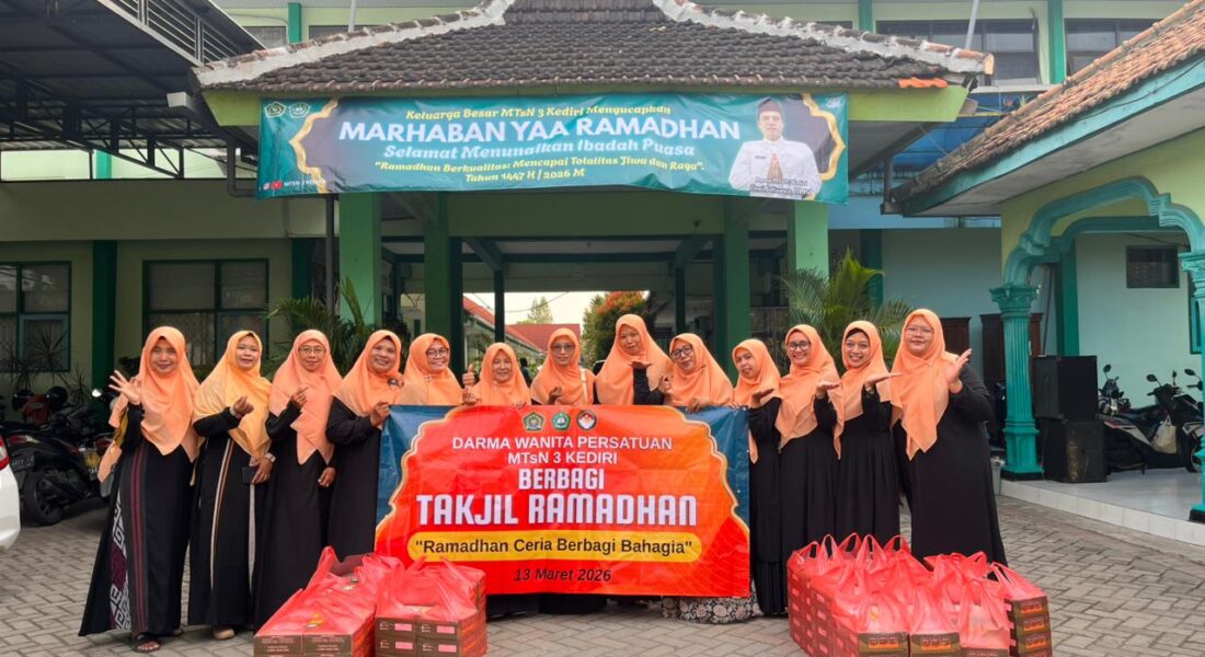 Kab. Kediri (MTsN 3) – Dharma Wanita Persatuan (DWP) MTsN 3 Kediri menggelar kegiatan berbagi takjil kepada para pengguna jalan yang melintas di depan gerbang madrasah, Jumat (13/3/2026). Kegiatan ini dilaksanakan usai rapat dinas keluarga besar MTsN 3 Kediri sebagai wujud kepedulian serta upaya menebar kebaikan di bulan suci Ramadan.