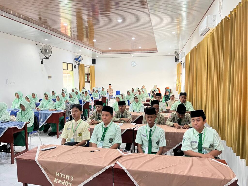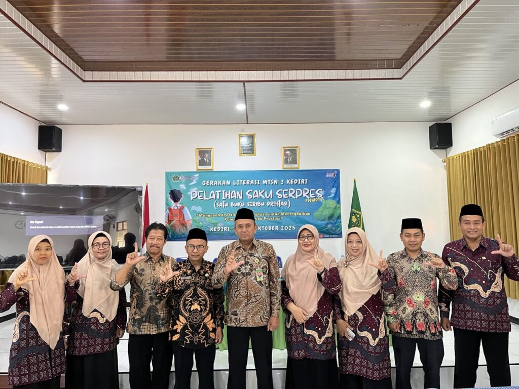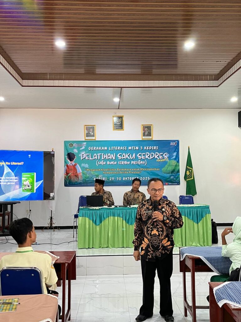 Kab. Kediri (MTsN 3) – Sebanyak 60 siswa terpilih mengikuti Pelatihan Menulis Satu Buku Seribu Prestasi (Saku Serpres) season 2, Rabu (29/10/2025). Pelatihan Saku Serpres yang diselenggarakan oleh MTsN 3 Kediri turut mengundang siswa dari MTs Tribhakti, MTs Al Muttaqin, MTs Darul Mutaallimin, MTs Mif. Ulum, dan MTs Al Hidayah.Kegiatan ini berlangsung selama dua hari, dari tanggal 29 hingga 30 Oktober 2025. Kegiatan ini diselenggarakan di ruang pertemuan madrasah serta secara resmi dibuka Siti Aliyah selaku Kepala MTsN 3 Kediri.