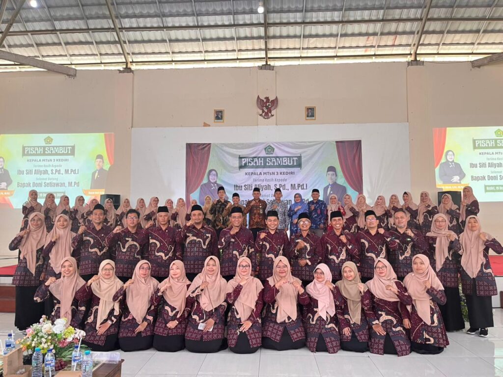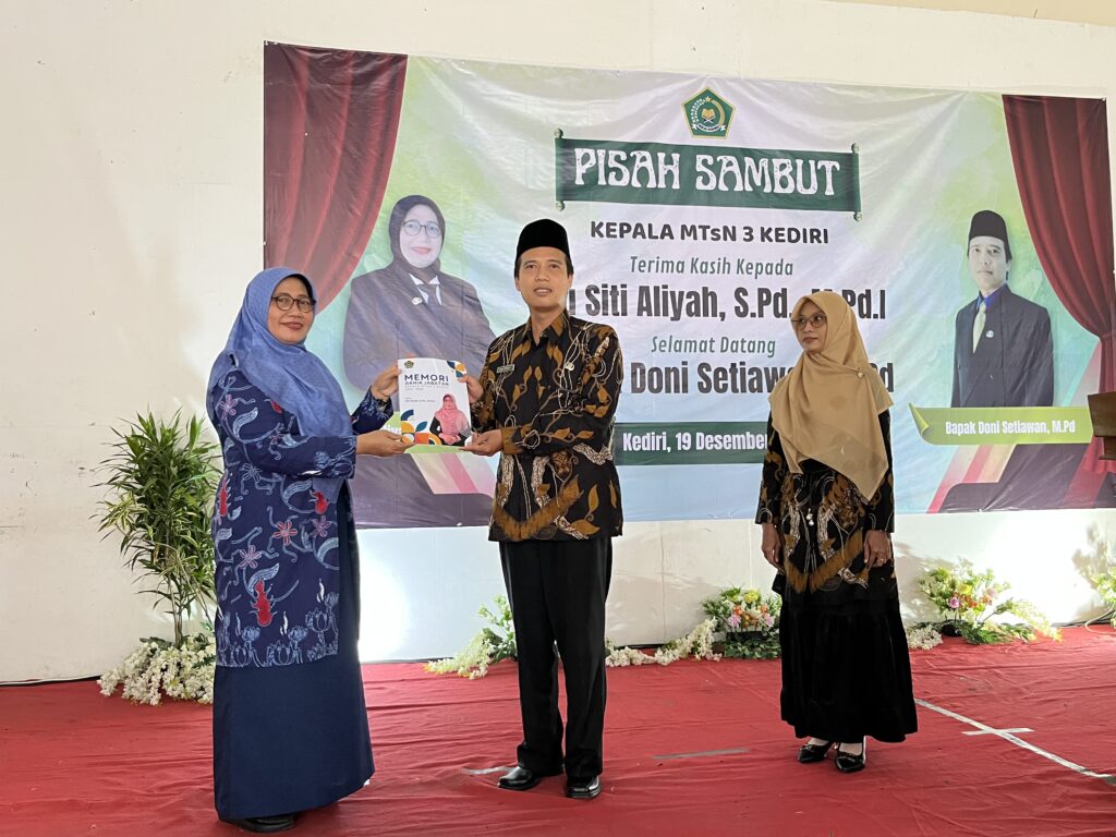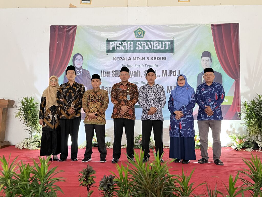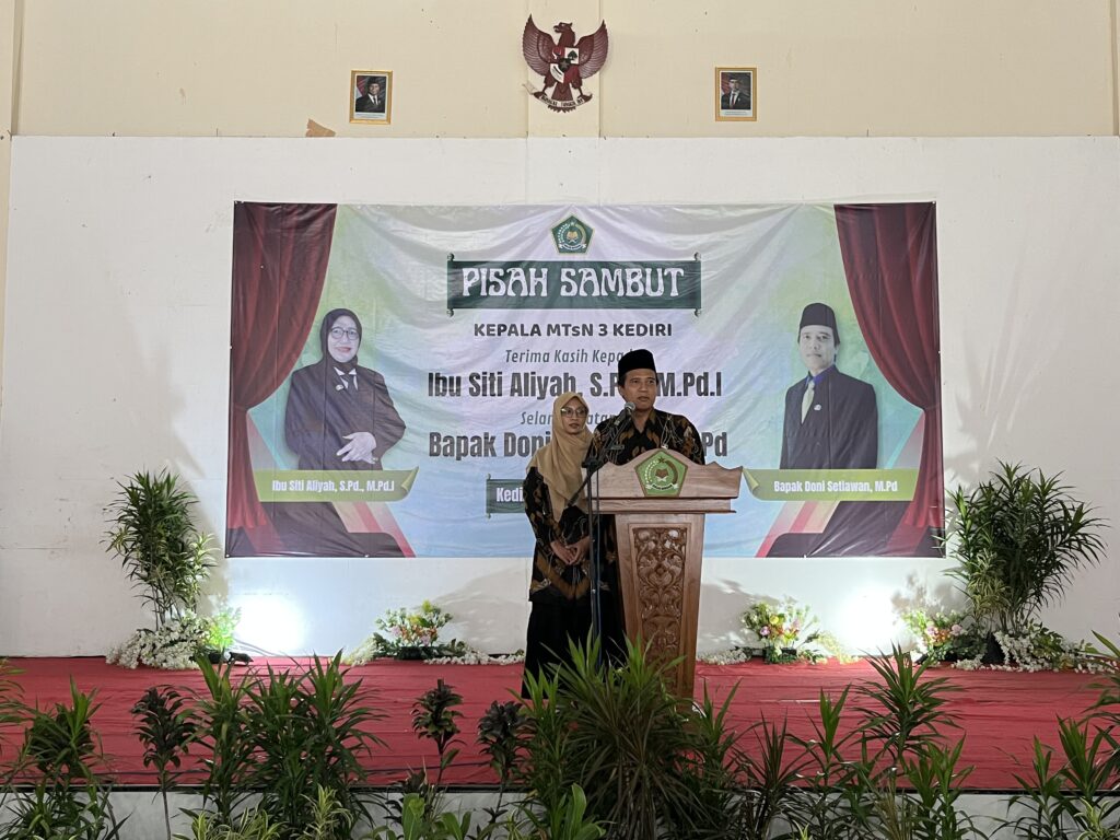 Kab. Kediri (MTsN 3) -Madrasah Tsanawiyah Negeri (MTsN) 3 Kediri mengadakan acara pisah sambut kepala madrasah di Aula As-Sholih, Jumat (19/12). Ibu Siti Aliyah yang telah mengabdi selama 4 tahun di MTsN 3 Kediri digantikan Bapak Doni Setiawan. Acara dihadiri Kepala Kantor Kemenag Kab. Kediri Achmad Faiz, Kasubbag TU, Kasi Pendma, Komite, Kepala Madrasah se-KKM MTsN 3 Kediri, Kepala MIN, MTsN, MA se-Kabupaten Kediri, dan Forkompimcam.