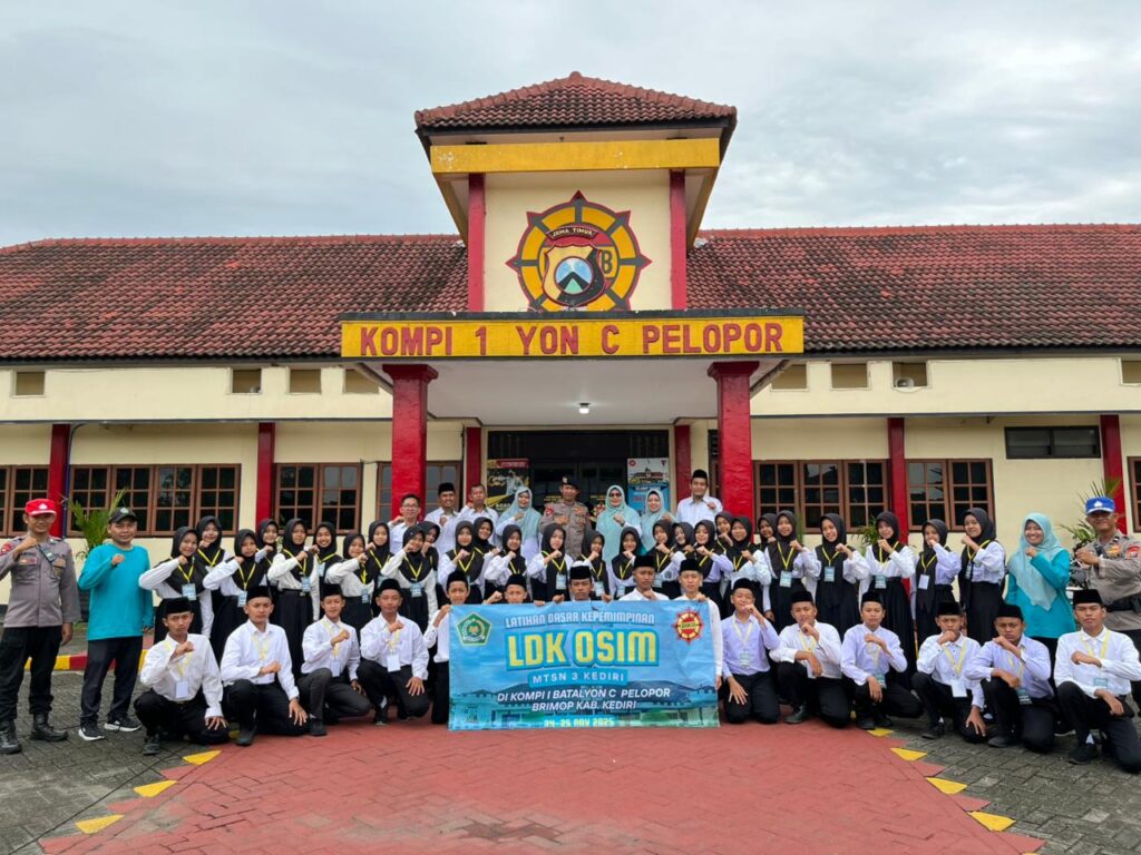 Kab.Kediri (MTsN 3) – Sebanyak 43 anggota Organisasi Siswa Madrasah (OSIM) MTsN 3 Kediri mengikuti Latihan Dasar Kepemimpinan (LDK) di Kompi 1 Batalyon C Pelopor SAT BRIMOB Polda Jatim, Senin (24/11). Kegiatan yang berlangsung tanggal 24-25 November 2025 dibuka secara langsung Siti Aliyah selaku Kepala MTsN 3 Kediri. LDK OSIM tahun ini mengusung konsep berbeda yakni menggandeng korps Brimob Batalyon C Pelopor yang berlokasi di Jl. Veteran, Mojoroto, Kec. Mojoroto, Kota Kediri.