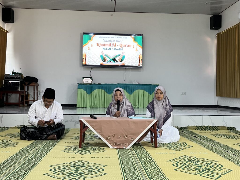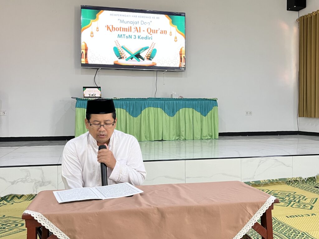 Kab. Kediri (MTsN 3) – Dalam rangka memperingati Hari Amal Bhakti (HAB) ke-80 Kementerian Agama Republik Indonesia, MTsN 3 Kediri menggelar acara Khotmil Qur’an, Jumat (2/1). Acara ini berlangsung dengan khidmat di meeting room Madrasah, yang dihadiri oleh Kepala Madrasah Doni Setiawan, M.Pd., beserta seluruh jajaran guru dan tenaga kependidikan Madrasah.