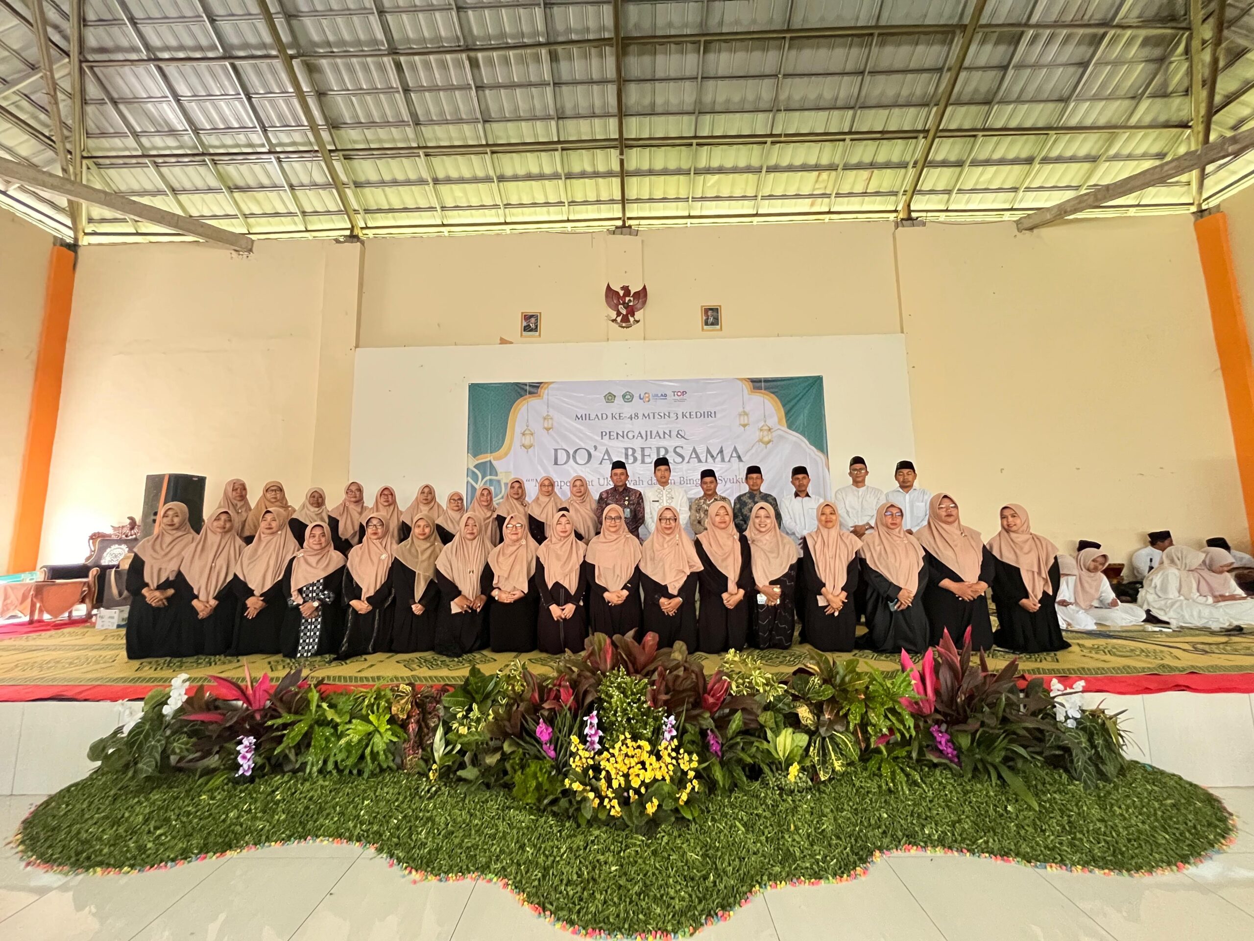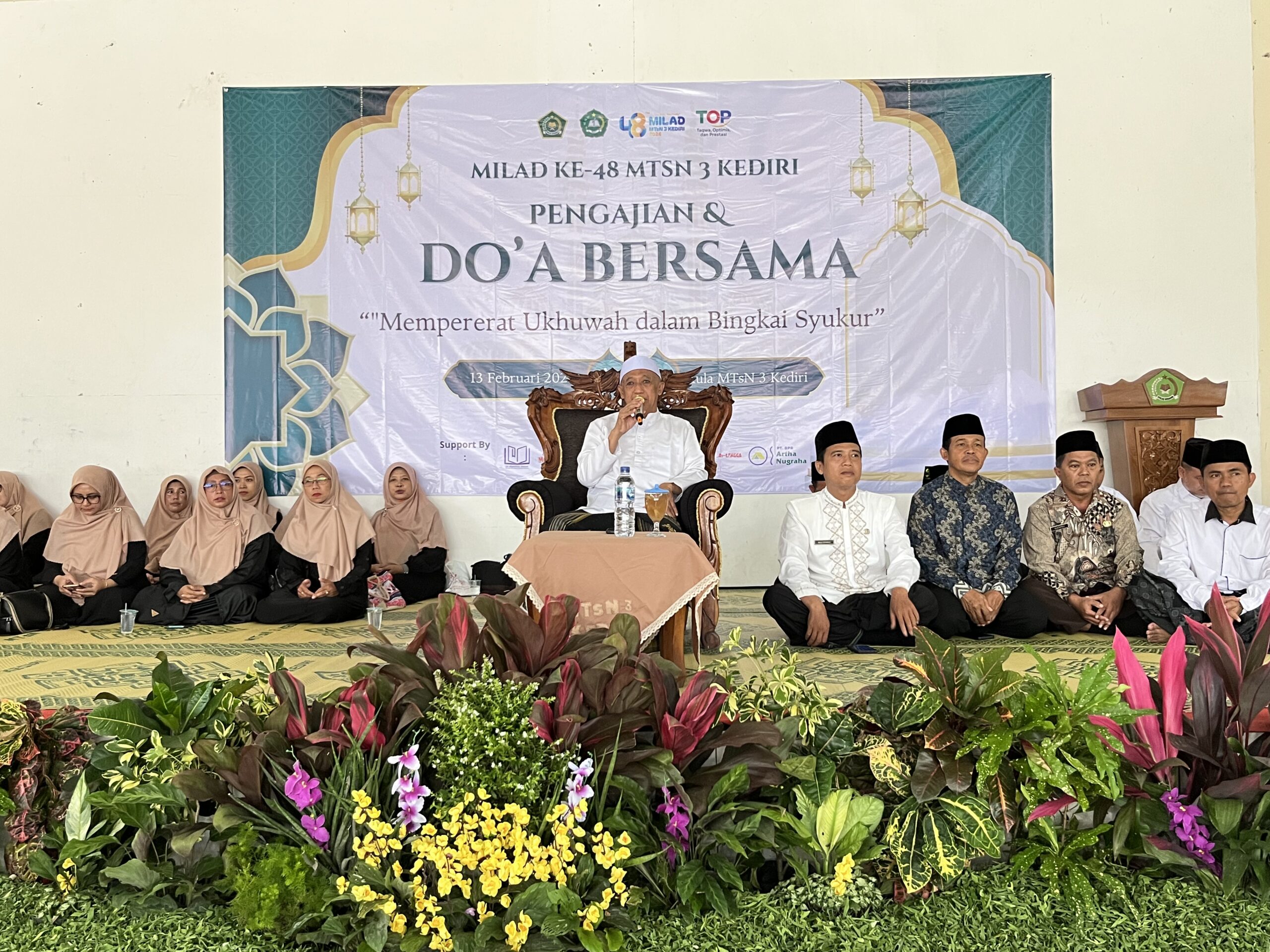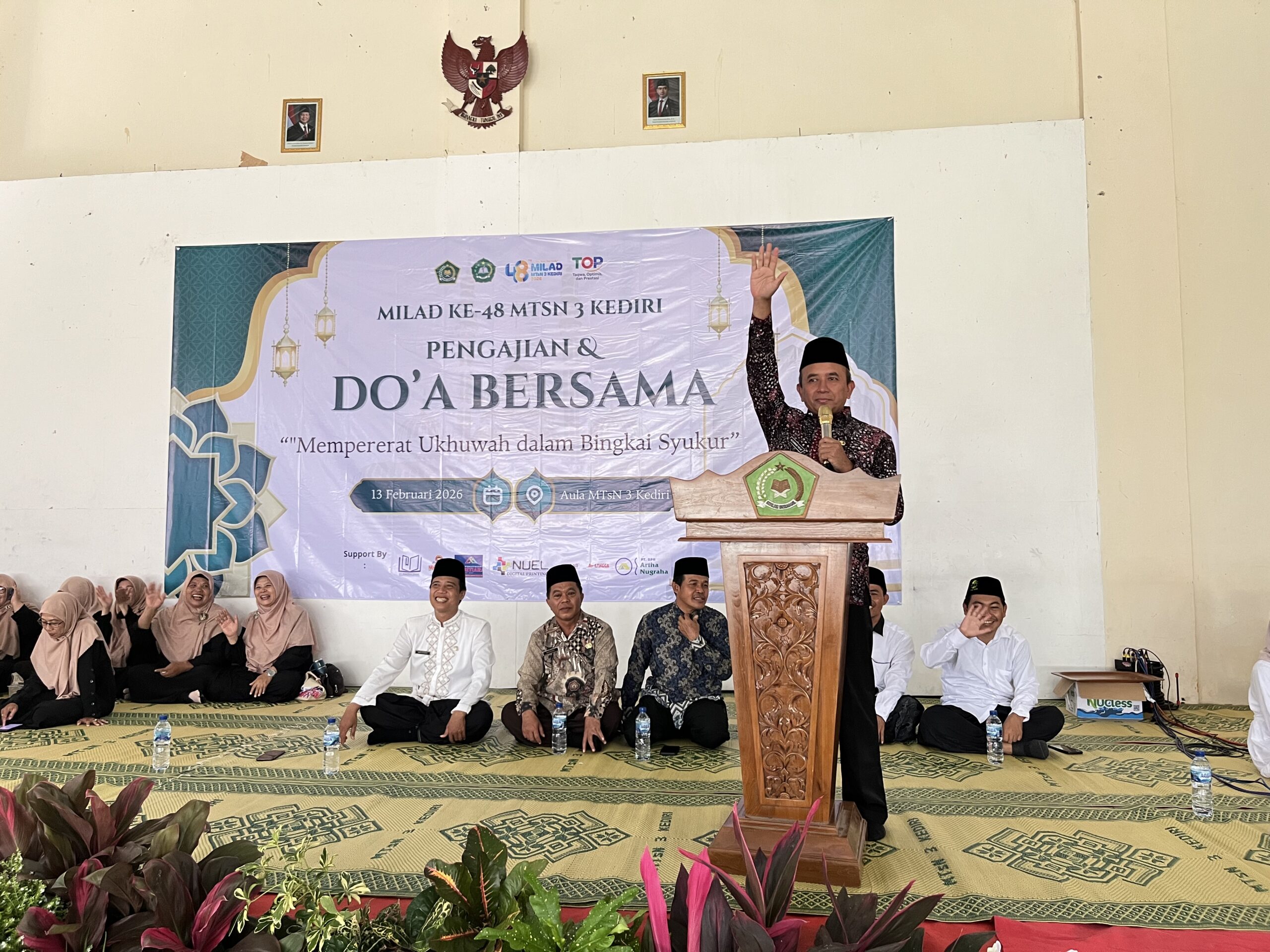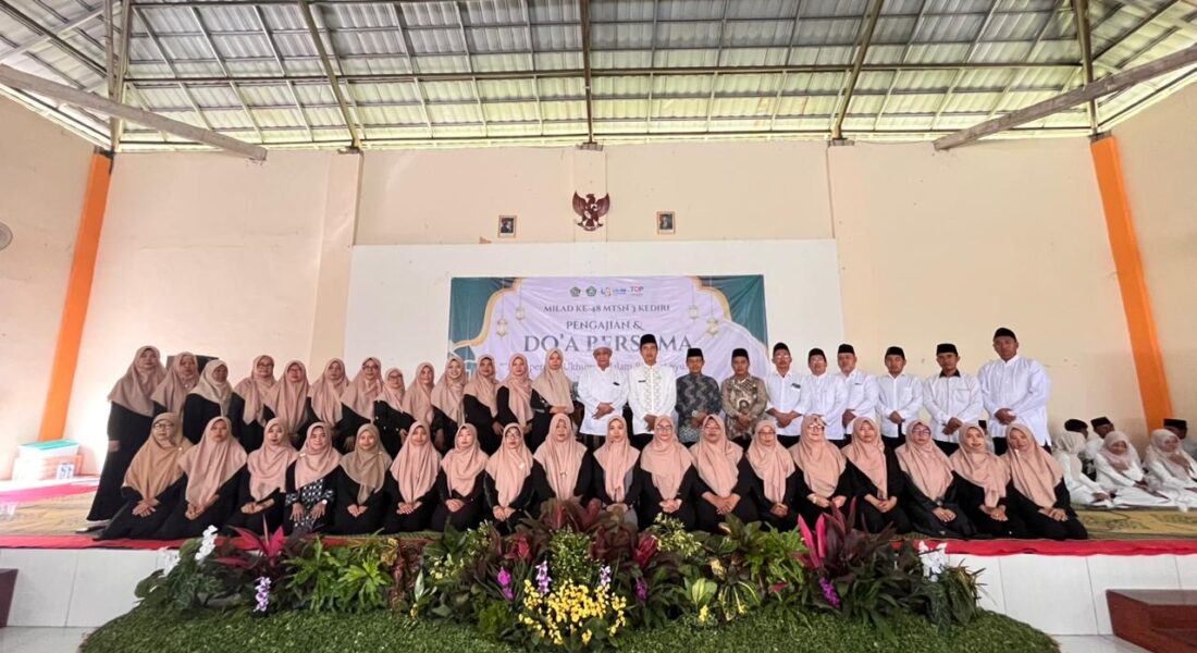 Kab. Kediri (MTsN 3) – Rangkaian peringatan Milad ke-48 MTsN 3 Kediri ditutup dengan kegiatan doa bersama dan istighosah yang berlangsung khidmat di Aula As-Sholih, Jumat (13/2). Turut hadir pada kegiatan tersebut Achmad Fa’iz Kepala Kantor Kementerian Agama Kabupaten Kediri. Kegiatan ini diikuti seluruh warga madrasah, mulai dari siswa, guru, hingga tenaga kependidikan sebagai bentuk rasa syukur atas perjalanan dan capaian madrasah selama ini. Turut hadir dalam kegiatan tersebut Kepala MAN 2 Kediri dan Kepala KUA Purwoasri sebagai tamu undangan.