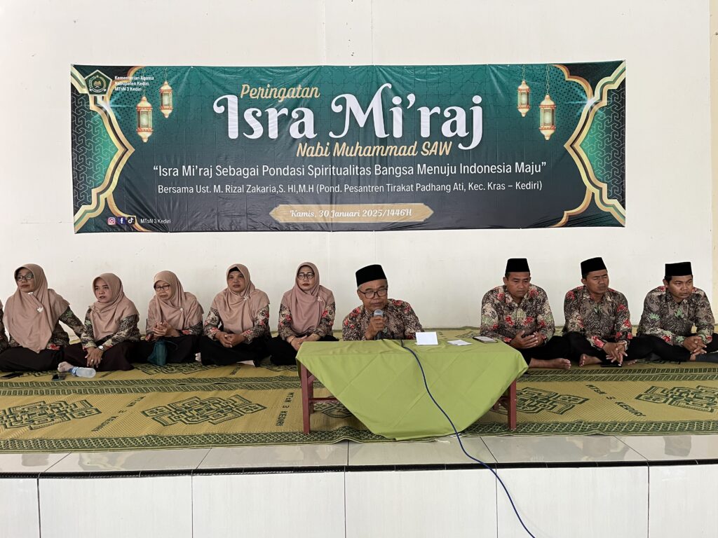 Kab. Kediri (MTsN 3) – Menyambut bulan suci Ramadhan 1446 Hijriah, MTsN 3 Kediri mengadakan doa bersama dan motivasi belajar di Aula As-Sholih, (26/2).Kegiatan ini diikuti oleh seluruh siswa kelas 7, 8, 9, guru dan karyawan. Kegiatan doa bersama yang dipandu oleh Iswahyudin dimulai pukul 08.00 wib. Kemudian pada mauidoh hasanahnya Komarodin mengajak siswa madrasah meningkatkan ketawadukan kepada Bapak/Ibu Guru, karena di madrasah Bapak/Ibu Guru adalah orang tua kalian.